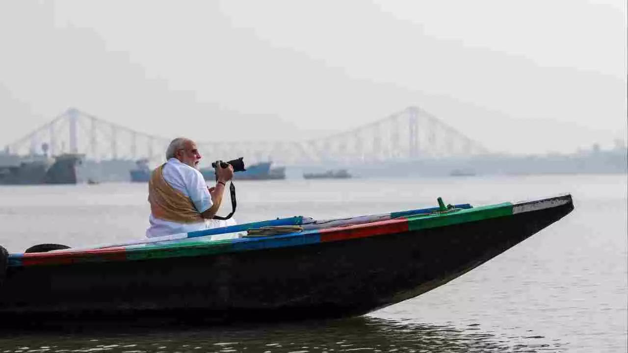 ವಿದ್ಯಾಸಾಗರ್ ಸೇತುವಿನ ಹಿನ್ನೆಲೆಯಲ್ಲಿ ಮರದ ದೋಣಿಯಲ್ಲಿ ಕುಳಿತಿರುವ ಮತ್ತು ಫೋಟೋಗ್ರಫಿ ಮಾಡುತ್ತಿರುವ ಸುಂದರ ಚಿತ್ರಗಳು ಹಾಗೂ ವಿಡಿಯೋವನ್ನು ಪ್ರಧಾನಿ ಮೋದಿ ತಮ್ಮ 'ಎಕ್ಸ್' (X) ಖಾತೆಯಲ್ಲಿ ಹಂಚಿಕೊಂಡಿದ್ದಾರೆ.